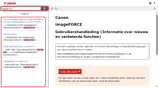 Zoeken door de versie als trefwoord in te voeren (bijvoorbeeld "versie 4.00") geeft een lijst van pagina's weer die dat trefwoord bevatten. U kunt vervolgens zoeken door de aangegeven pagina's.