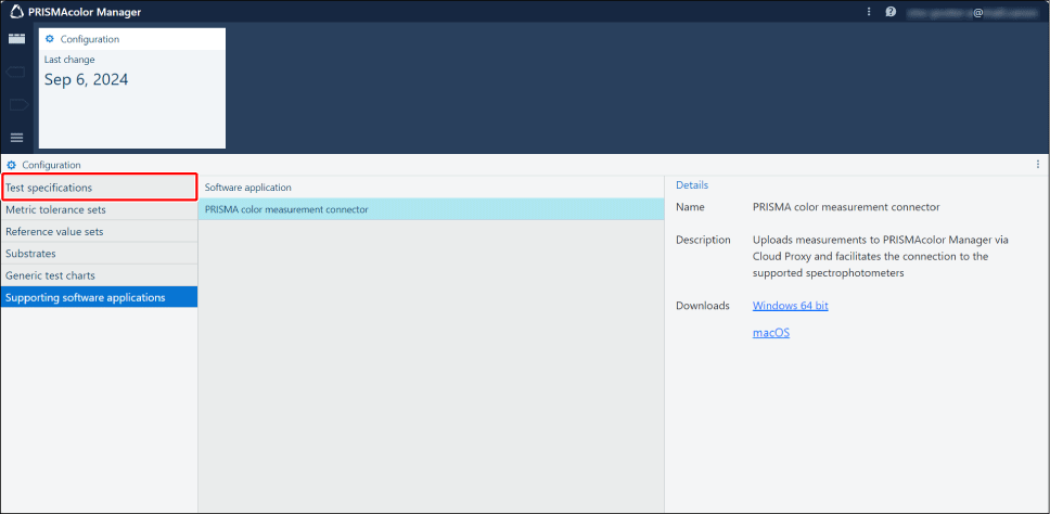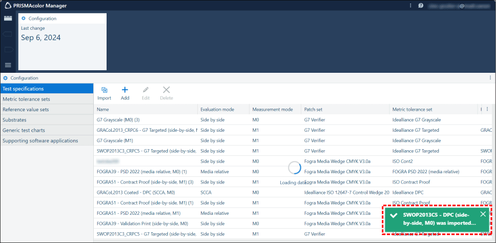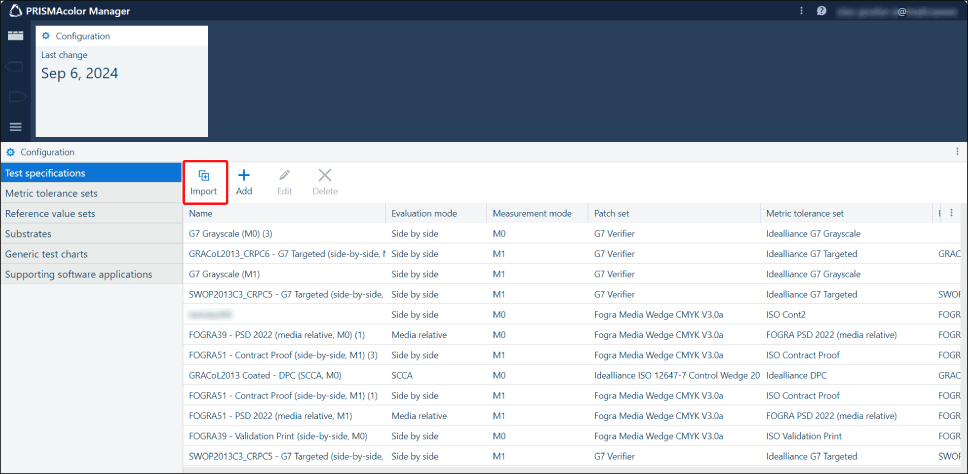 Standaard zijn er meerdere sets van testspecificaties met items en referentiewaarden voor verschillende normen beschikbaar. Selecteer de testspecificaties die u voor de kleurvalidatie wilt gebruiken en importeer ze in uw computeromgeving.