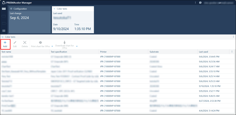 Combineer de geïmporteerde testspecificaties, de printer voor de kleurvalidatie en het te gebruiken papier om instellingen voor de kleurentest te maken, en sla deze instellingen op in PRISMAcolor Manager. De opgeslagen instellingen kunnen worden hergebruikt.