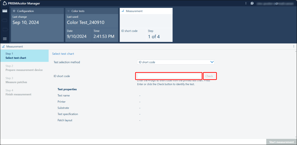 Typ het "ID short code"-nummer dat op de afgedrukte kleurenkaart staat in [Korte code id] en klik vervolgens op [Controleren].