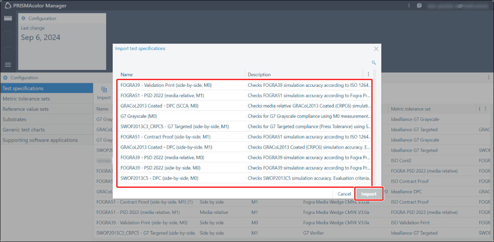 Du har tillgång till flera uppsättningar testspecifikationer med inställningar och referensvärden för olika standarder. Välj de testspecifikationer som du vill använda för färgvalideringen och importera dem till den aktuella miljön.