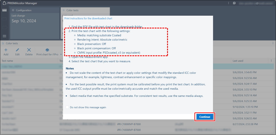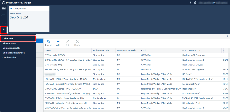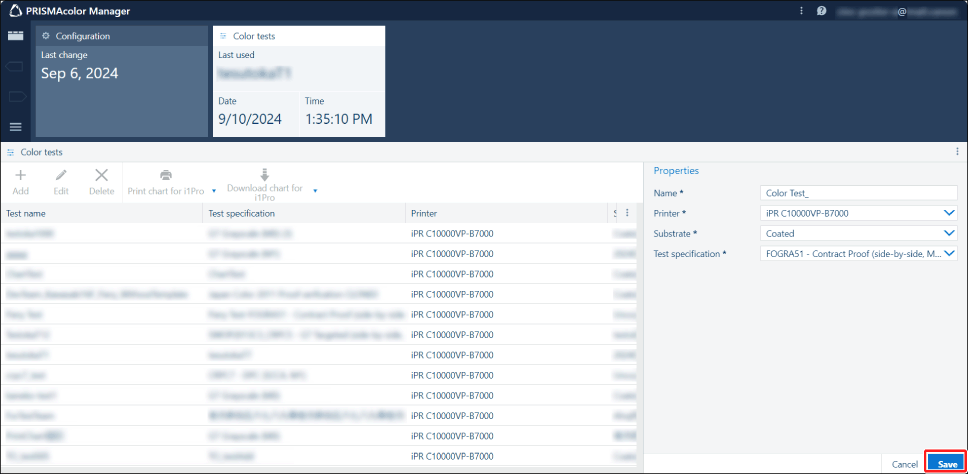 Ange de importerade testspecifikationerna, skrivaren för färgvalidering och papperet som ska användas för att skapa färgtestinställningar. Spara inställningarna i PRISMAcolor Manager. Sparade inställningar kan återanvändas.