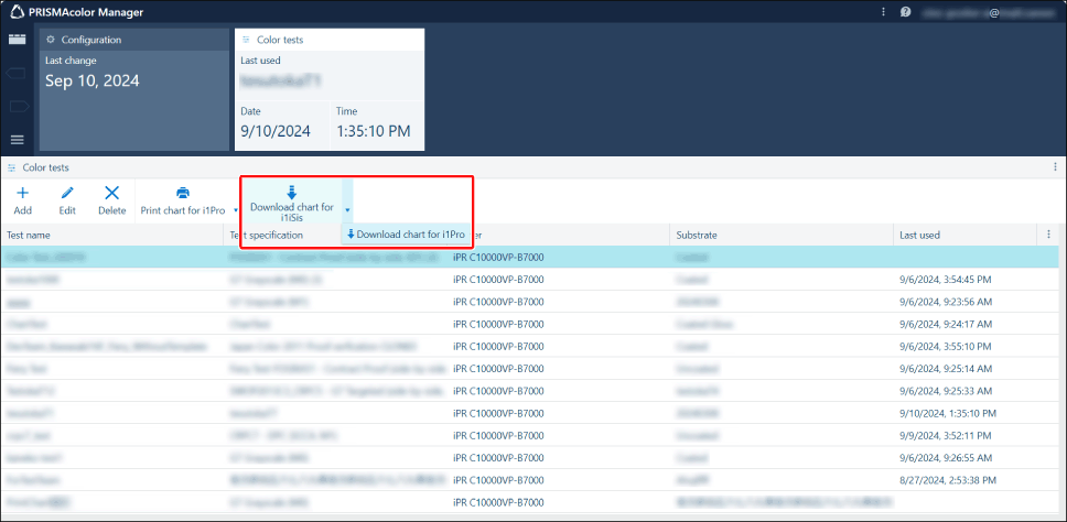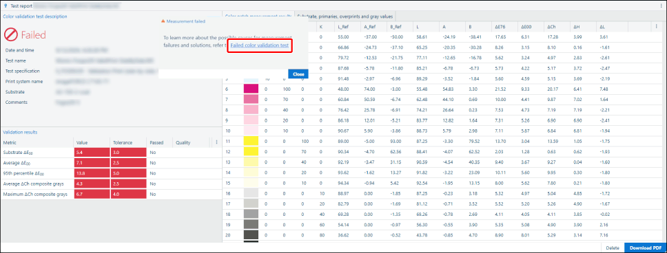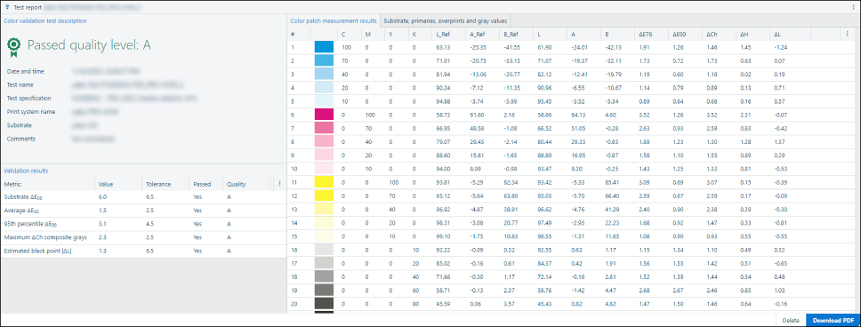 Resultatet av färgmätningen laddas upp till PRISMAcolor Manager. Skärmen med testrapporten visas efter en stund.