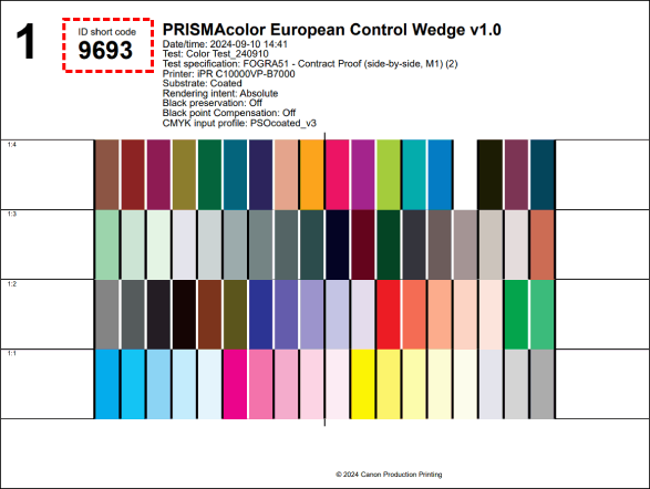 Följande testspecifikationer är lämpliga för initial testning. FOGRA51 – Contract Proof (side-by-side, M1) GRACoL2013 Coated – DPC (side-by-side, M1) G7 Grayscale (M0) |