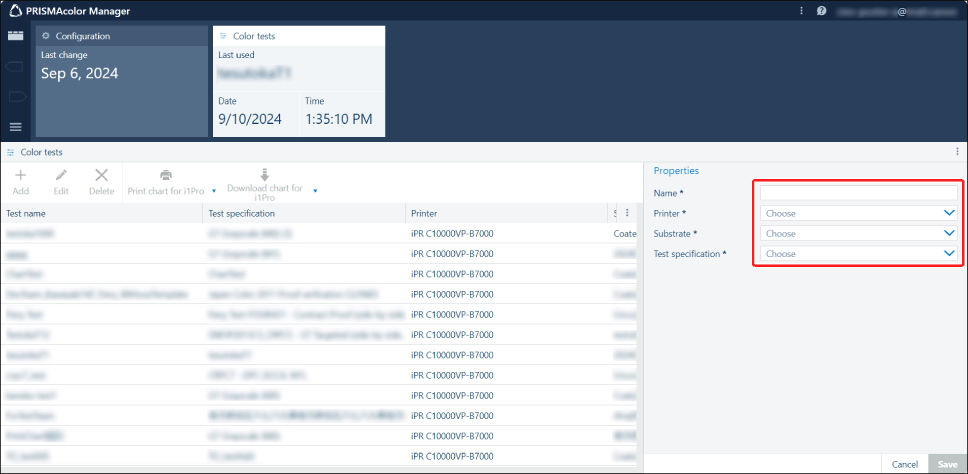 Combina as especificação de teste importadas, impressora para validação de cores e papel a usar para criar as definições de teste de cor. Guardar as definições no PRISMAcolor Manager. As definições guardadas podem voltar a ser utilizadas.