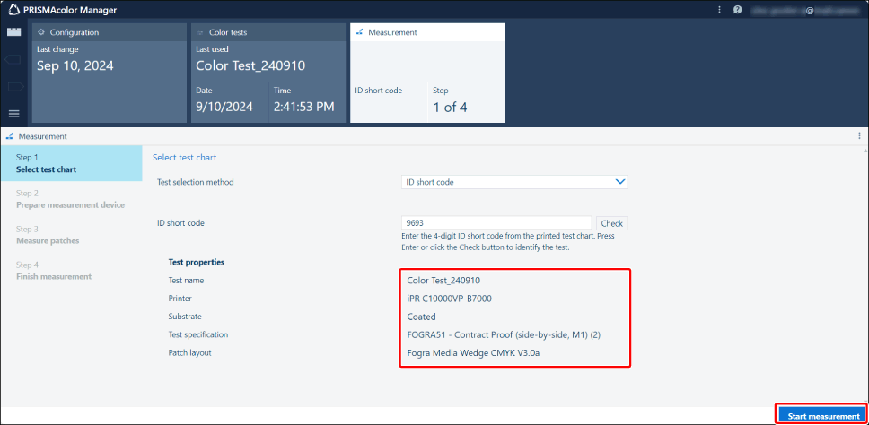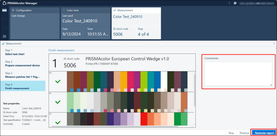 Os resultados da medição de cores são enviados para o PRISMAcolor Manager. O ecrã de relatório de teste será apresentado após uns momentos.