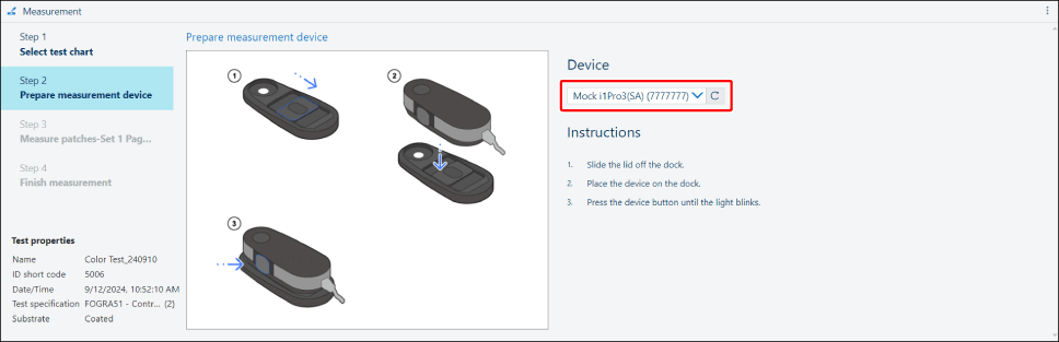 Se estiverem ligados vários espectrofotómetros, use o menu desdobrável para selecionar o espectrofotómetro selecionado ao transferir o mapa de cores.