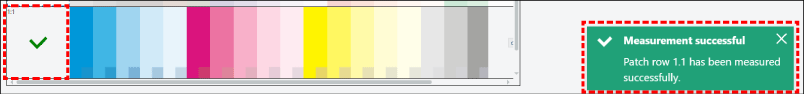 Se for apresentada no canto inferior direito do ecrã uma marca de verificação para a linha medida e uma mensagem verde a indicar que a medição da cor foi bem sucedida, avance para a linha seguinte.