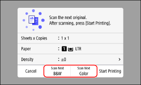 1 | Place the next original on the platen glass, and press [Scan Next B&W] or [Scan Next Color]. The next original is scanned, and the same screen is displayed. Repeat this process until scanning of all originals is completed. You can select the color mode (Black & White or Color) for each original. To copy the next original in black and white, press [Scan Next B&W]. To copy in color, press [Scan Next Color]. You can also press [Density], [Original Type], and [Color Balance] to change the settings for each original. If the size of the original is different, part of the image may be missing, or the image may be printed smaller on the paper. |