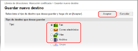 Seleccione el tipo de destino y haga clic en [Aceptar].