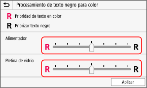 En [Alimentador] o [Pletina de vidrio], realice el ajuste dando prioridad a que se reproduzca el texto en color o el texto negro.