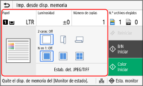 En el panel de control, pulse [Imp. desde disp. de mem.] en la pantalla [Inicio].
