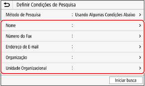 4 | Selecione [Método de Pesquisa] e selecione as condições de pesquisa. Para pesquisar usuários que atendam a todos os itens especificados na Etapa 3, selecione [Usando Todas as Condições Abaixo]. Para pesquisar usuários que atendam a qualquer um dos itens especificados na Etapa 3, selecione [Usando Algumas Condições Abaixo]. |
