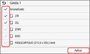 Os tamanhos de papel cujas caixas de seleção estão desmarcadas não serão exibidos na tela de configurações de papel.
