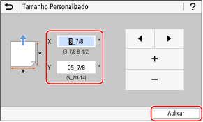 2 | Digite os valores em [X] e [Y] e pressione [Aplicar]. Selecione [X] ou [Y], e digite o comprimento de cada lado usando [+] e [-], com  /  para mover o cursor entre os dígitos para inserção de números inteiros e frações. Quando tamanhos fora do padrão usados com frequência são registrados, você pode acessá-los pressionando [S1] a [S3]. |