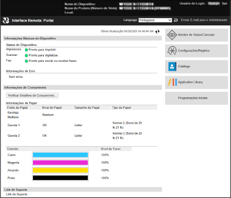 Quando você faz login na UI Remota, a página do Portal (página inicial da UI Remota) é exibida. Daqui, você pode verificar o status das operações da máquina, visualizar várias informações e alterar as configurações de operação dos botões.