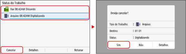 Se a tela lista de trabalhos for exibida, selecione o trabalho para cancelar e pressione [Cancelar] [Sim].