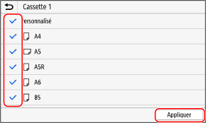 Les formats de papier dont les cases sont décochées ne sont pas affichés sur l'écran de paramétrage du papier.