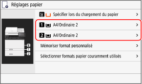 Par défaut, le format et le type de papier du tiroir à papier sont paramétrés comme A4 et Ordinaire 2. Lorsque du papier d'un format ou d'un type différent est chargé, modifiez les paramètres du papier.