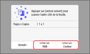 Vous pouvez copier le verso avec un mode de couleur différent (noir et blanc ou couleur) de celui du recto. Pour copier le dos en noir et blanc, appuyez sur [Lecture suiv. N&B]. Pour copier en couleur, appuyez sur [Lecture suiv. Couleur].