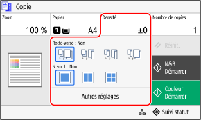 En plus des paramètres de copie de base, la machine dispose également de paramètres de copie recto-verso, de réglage de la qualité d'image et d'autres paramètres en fonction de votre original et de vos besoins. Utilisez l'écran de copie pour configurer ces paramètres.