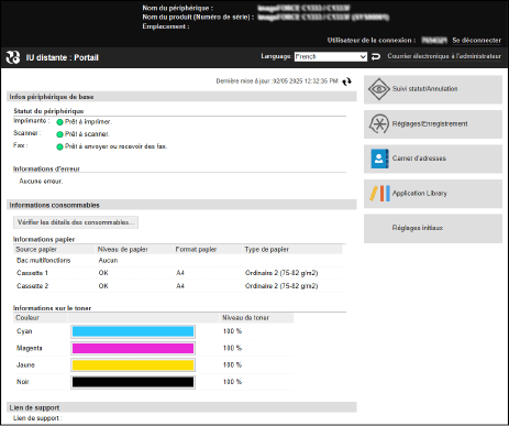 Lorsque vous vous connectez à l'interface utilisateur distante, la page Portail (page d'accueil de l'interface utilisateur distante) s'affiche. Depuis cette page, vous pouvez vérifier l'état d'utilisation de l'appareil, afficher diverses informations et changer les paramètres au moyen de boutons.