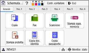 ![]() | [Impostaz. sch. princ.] Consente di aggiungere i pulsanti di collegamento alla schermata [Schermata princip.] e di modificare la disposizione dei pulsanti. Personalizzazione della schermata [Schermata princip.] | |