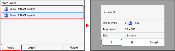 Se viene visualizzata la schermata dell’elenco lavori, selezionare il lavoro da annullare e premere [Annulla]