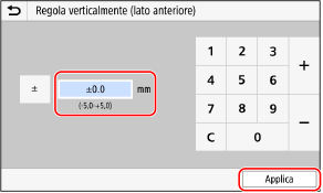 Specificare la direzione di regolazione con i tasti + e -, poi specificare la larghezza di regolazione in unità di 0,1 mm.