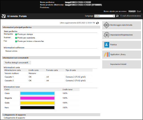 Quando si accede alla IU remota, viene visualizzata la pagina portale (prima pagina della IU remota). Da qui è possibile verificare lo stato operativo della macchina, visualizzare varie informazioni e modificare le impostazioni mediante l’utilizzo dei pulsanti.