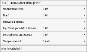 * È la stessa impostazione di [N in 1] presente nella schermata Impostazioni stampa supporto memoria. Tuttavia [9 in 1] e [16 in 1] sono disponibili solo per [N in 1] sulla schermata [Impostazione dettagli PDF]. |