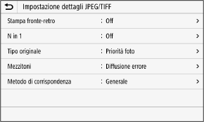 Usare questa schermata per configurare delle impostazioni di stampa dettagliate per file JPEG e TIFF, quali la regolazione della qualità dell'immagine.
