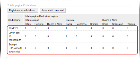 È possibile visualizzare il numero di pagine stampate e copiate per ciascun ID reparto quando la gestione ID reparto è abilitata.