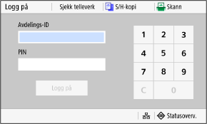 Når Administrere avdelings-ID er satt opp, vises følgende skjermbilde for innlogging. Skriv inn avdelings-ID når du vil logge inn. Hvis det er angitt en PIN-kode, skriver du inn denne.