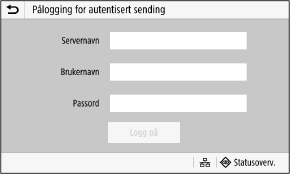 Når godkjent sending (LDAP-servergodkjenning) er satt opp, vises skjermbildet innlogging for godkjent sending når du skanner og sender faks. Skriv inn brukernavnet og passordet som håndteres med LDAP-serveren når du vil logge inn.
