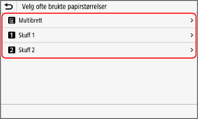 Skjermbildet for papirinnstillinger viser registrerte, ofte brukte papirformat. Hvis ubrukte papirformat vises, kan du skjule disse for hver papirkilde slik at det blir lettere å velge papirformat.