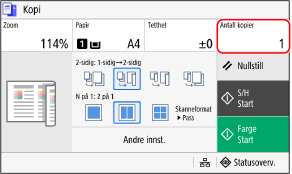 Trykk på [Antall kopier], bruk talltastene når du vil skrive inn antall kopier, og trykk så på [Lukk].