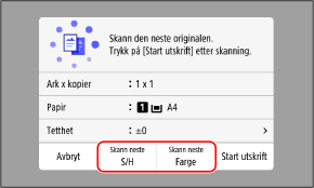 Du kan velge fargemodus (svart/hvitt eller farge) for hvert pass. Hvis du vil kopiere det neste passet i svart/hvitt, trykker du på [Skann neste S/H]. Når du vil kopiere farge, trykker du på [Skann neste Farge].