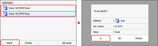 Hvis skjermbildet for jobbliste vises, velger du jobben som skal avbrytes og trykker på [Avbryt]