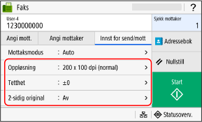 På fanen [Innst for send/mott] konfigurerer du skanneinnstillingene for originalen. Skanneinnstillinger for faksoriginaler