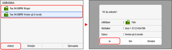 Hvis et skjermbilde med en jobbliste vises, velger du jobben som skal avbryte, og trykker på [Avbryt]