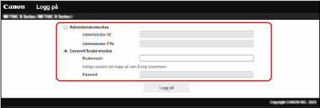Når du vil bruke Fjernkontroll, angir du IP-adressen til maskinen i en nettleser på en datamaskin, og logger inn med Administratormodus eller Generell brukermodus. Funksjonene som er tilgjengelige med Fjernkontroll varierer, avhengig av hvilken modus du er logget inn på.