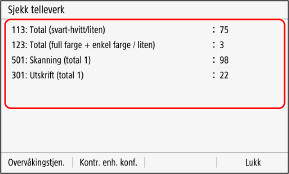 Handlinger som er tilgjengelig på skjermbildet for tellerElementene som vises på skjermen avhenger av land eller region. Trykk på [Overvåkingstjen.] når du vil sjekke forbindelsen til overvåkingserveren. Utfør denne handlingen når du vil jevnlig sende informasjonen for maskinen til overvåkingserveren. Trykk på [Kontr. enh. konf.] når du vil sjekke konfigurasjonen for alternativene på maskinen.