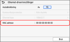 IP-adressen til maskinen og MAC-adressen trengs for å bruke Fjernkontroll og konfigurere innstillinger for brannmur. Sjekk disse gjeldende innstillingene.
