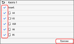 Размерите на хартията, чиито квадратчета за отметка са изчистени, не се показват на екрана с настройки на хартията.
