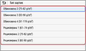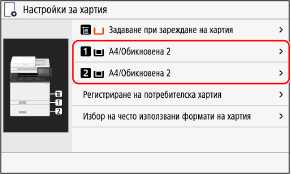 По подразбиране размерът и типът на хартията са зададени на A4 и Обикновена 2. Когато се зарежда хартия с различен размер или тип, променете настройките на хартията.
