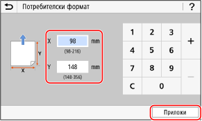 2 | Въведете стойностите в [X] и [Y], след което натиснете [Приложи]. Когато са регистрирани често използвани нестандартни размери, можете да ги извикате, като натиснете бутон от [S1] до [S3]. |