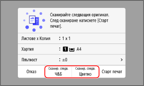 Когато оригинал се постави върху стъклото за сканиране и се копира чрез двустранно копиране или N в 1, се показва екранът за сканиране на следващия оригинал.