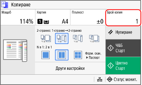 Натиснете [Брой копия], използвайте цифровите клавиши, за да въведете броя на копията, след което натиснете [Затвори].