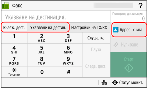Посочете местоназначението в раздела [Въвеж. дест.], раздела [Указване на дестин.] или в [Адрес. книга].